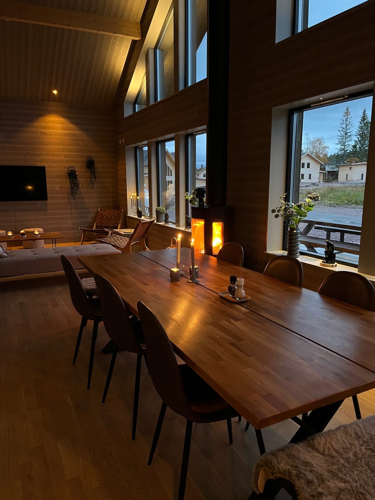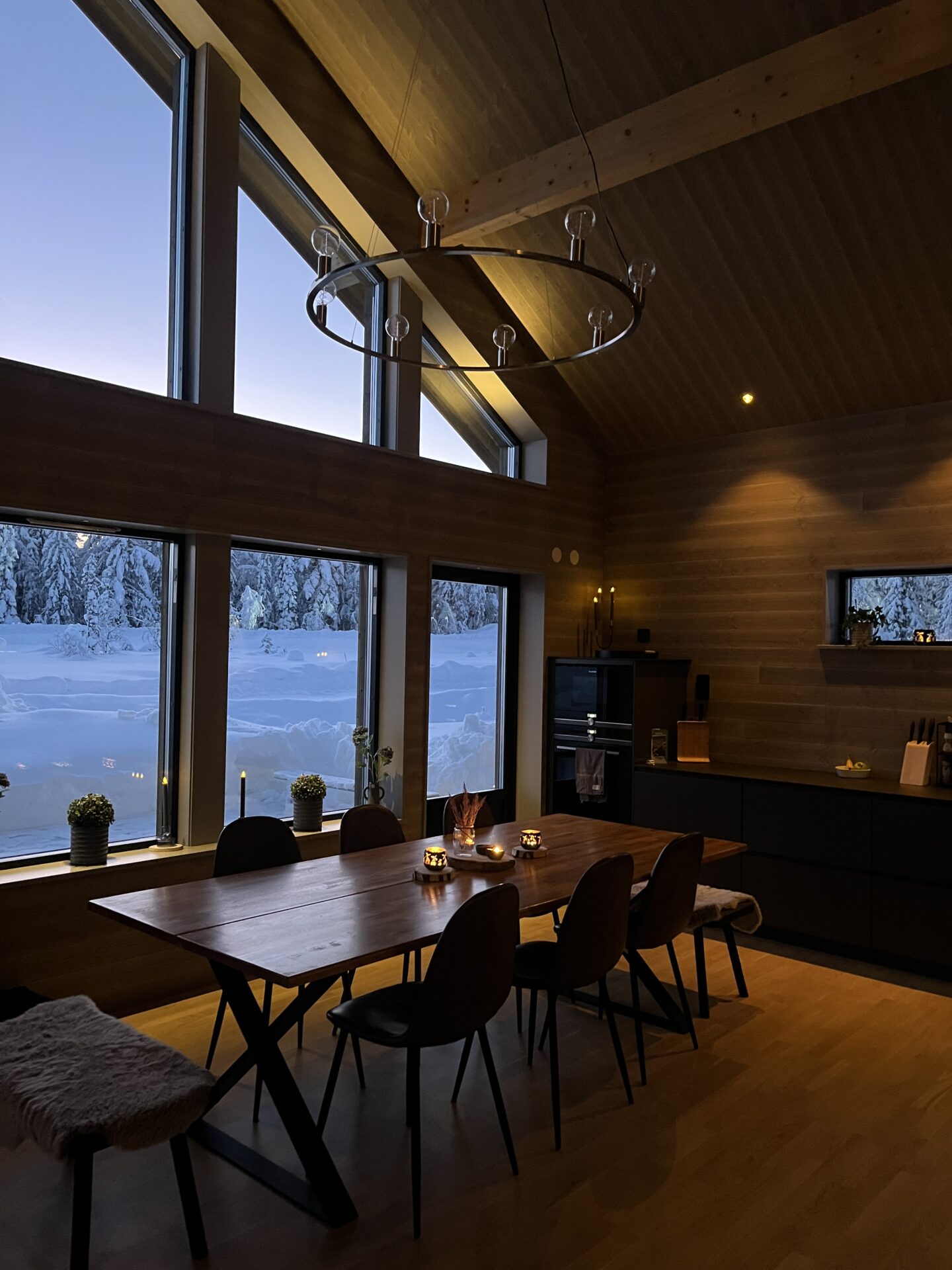 Köket i stugan i Sälen är fullt utrustat med hög standard och Siemens vitvaror. Det finns gott om utrymme för flera personer att laga mat samtidigt. Det är lätt att umgås mellan kök och vardagsrum då planlösning är öppen. Matbordet har plats för 10 personer och braskaminen är centrerad mellan kök och vardagsrum.