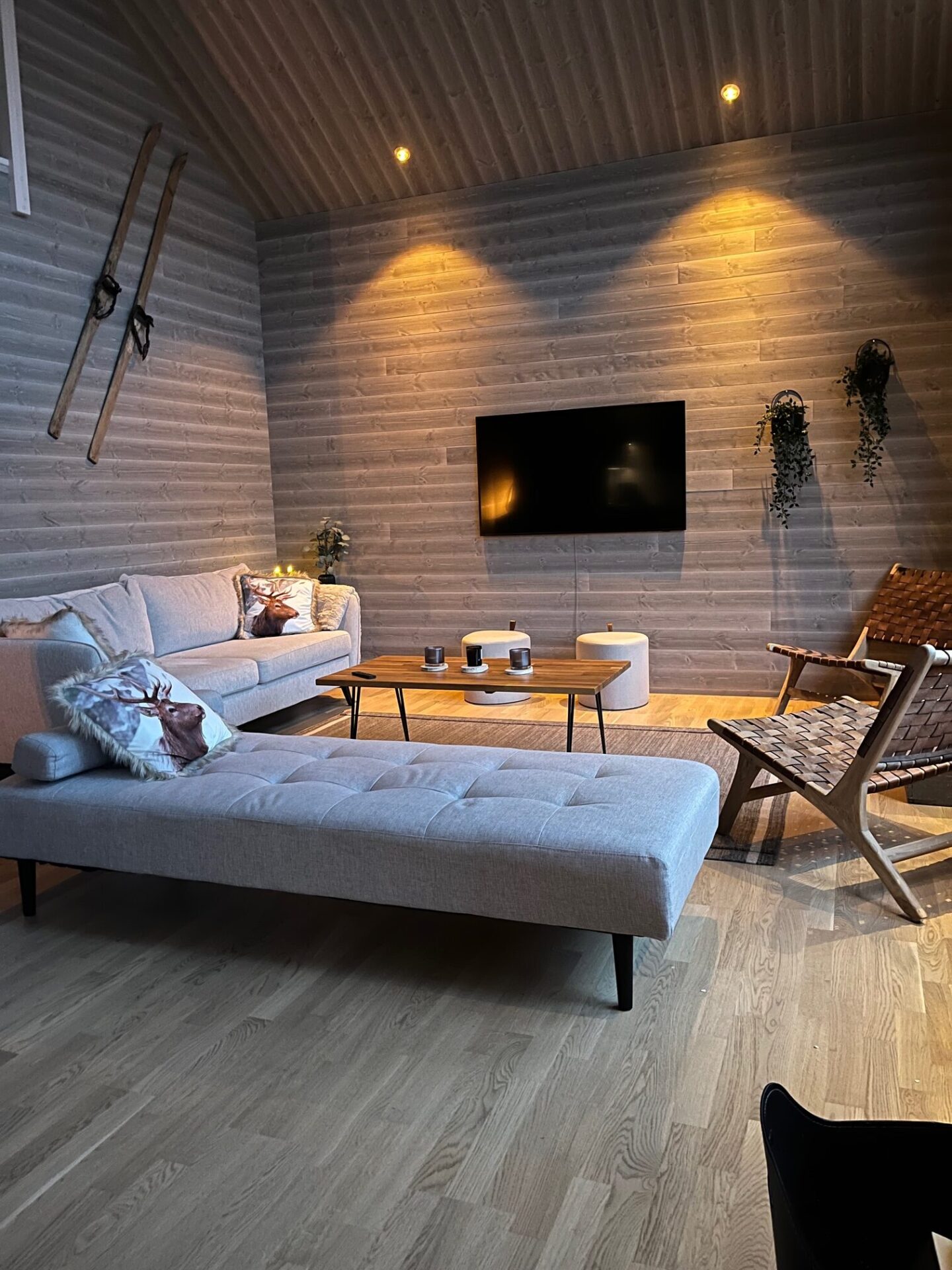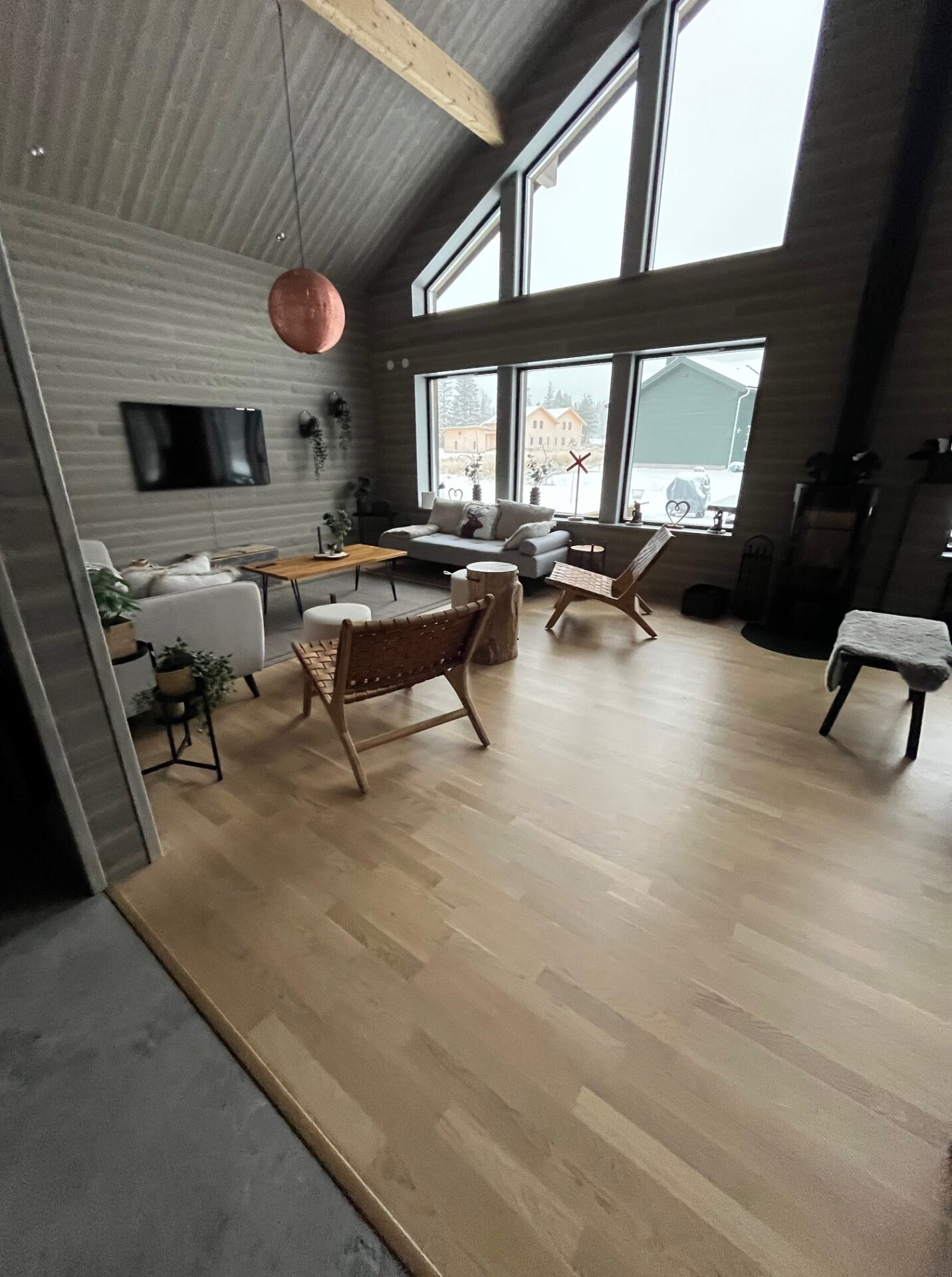 Vardagsrummet och köket ligger i öppen planlösning med dubbel takhöjd. Stor sällskapsytan med tv, bekväma fåtöljer och soffor att sjunka ner i efter en dag i pisten. Njut av brasa i kaminen med utsikt mot Lindvallens upplysta backar.